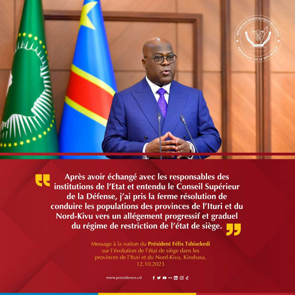 Le 03 mai 2021, face aux menaces graves pesant sur l’intégrité de notre territoire et à l’insécurité récurrente vécue par nos populations de l’Est du pays depuis trois décennies, je proclamais l’état de siège dans les Provinces de l’Ituri et du Nord Kivu.