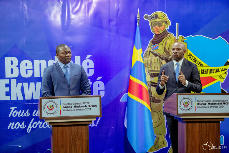 Le Directeur général de l’Agence de pilotage, de coordination et de suivi des conventions de collaboration signées entre la RDC et les partenaires privés (APCSC), Freddy Yodi Shembo, et le ministre de la Communication et Médias, Patrick Muyaya, ont tenu mardi 19 mars 2024 un briefing presse pour présenter les orientations de cette nouvelle structure gouvernementale.