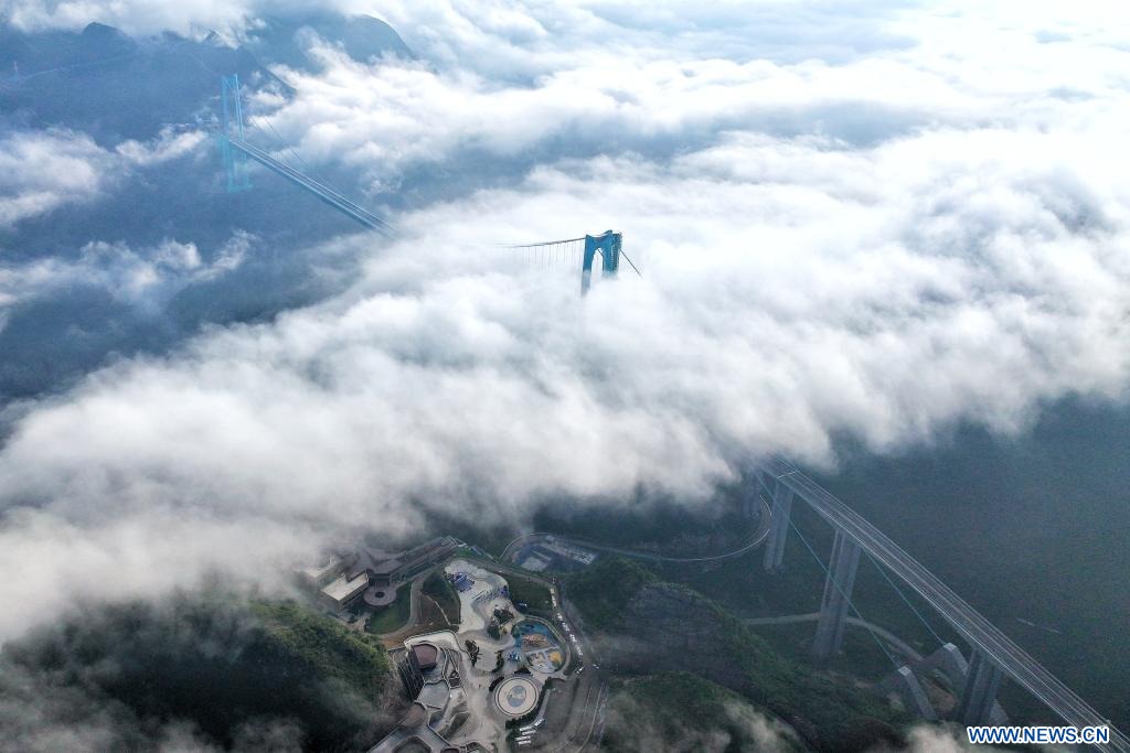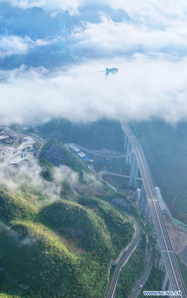GUIYANG, 28 septembre (Xinhua) -- Le plus haut pont du monde a été ouvert à la circulation dimanche matin dans la province chinoise du Guizhou (sud-ouest). Après trois ans de travaux, il permet de réduire le temps de trajet à travers un profond canyon de deux heures à seulement deux minutes.