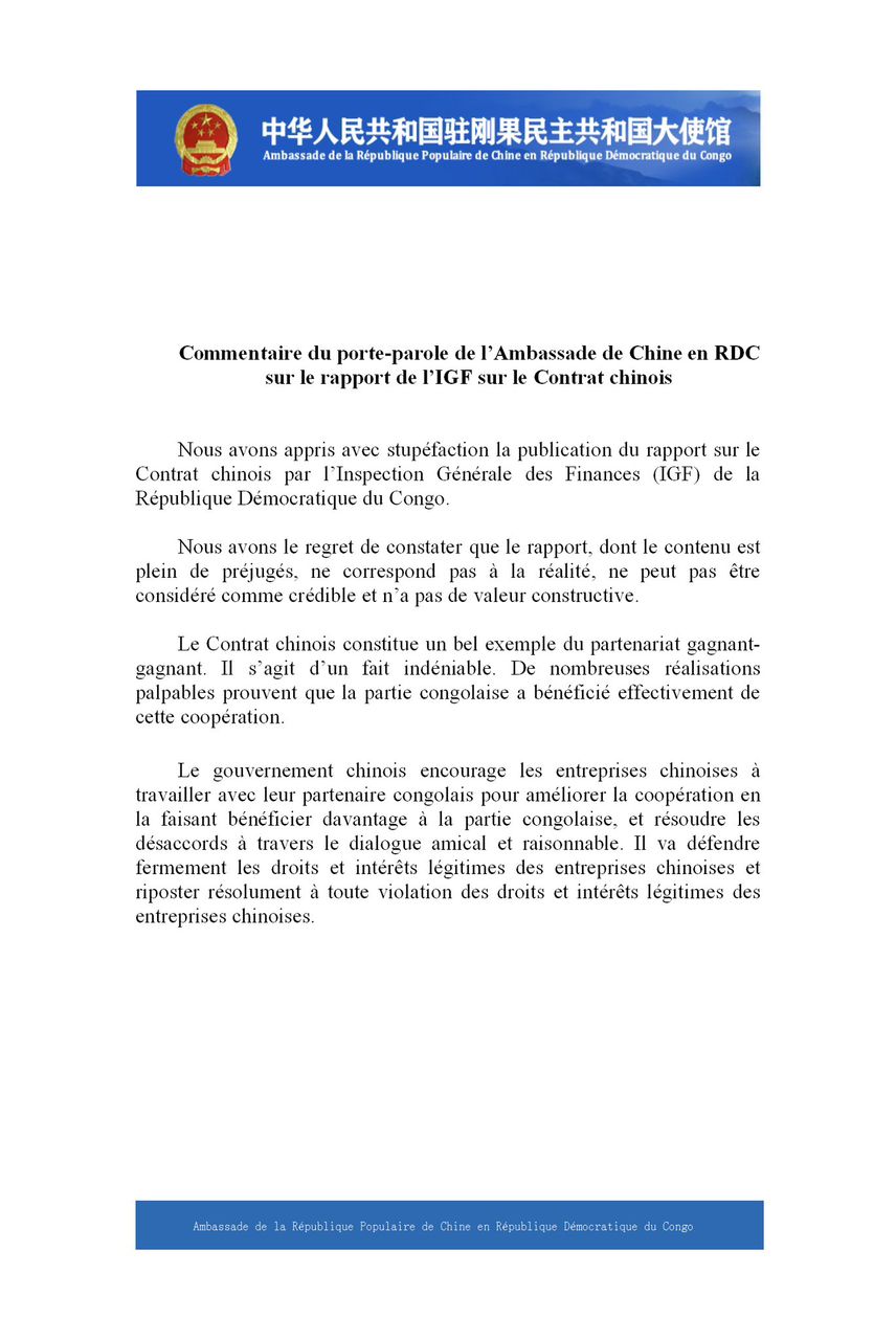 Commentaire du porte-parole de l’Ambassade de Chine en Rdc sur le rapport de l’IGF sur le contrat Chinois