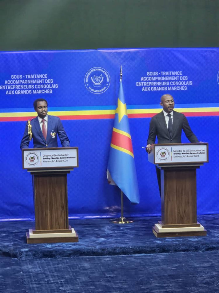 Le ministre de la Communication et Médias, Porte-parole du Gouvernement, Patrick Muyaya et le Directeur général de l’Autorité de régulation de la sous-traitance dans le secteur privé (ARSP), Miguel Kashal Katemb, ont animé conjointement un briefing presse hier jeudi 14 mars 2024 dans les locaux du studio Maman Angebi. L’objectif de cette rencontre était de présenter les mesures prises par le gouvernement pour accompagner les entrepreneurs congolais dans l’accès aux grands marchés de sous-traitance en République Démocratique du Congo.