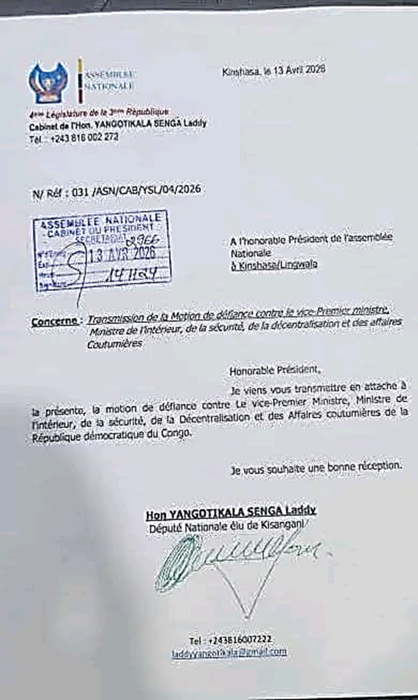 Dans une correspondance adressée au président de l'Assemblée nationale, hier lundi 13 avril à Kinshasa, l'élu de Kisangani annonce la transmission en bonne et due forme de cette initiative parlementaire. Le document, enregistré sous la référence 031/ASN/CAB/YSL/04/2026, porte la mention officielle de réception du cabinet du président de l'Assemblée nationale.