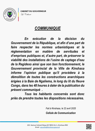 Dans un communiqué rendu public le mardi 22 avril, le gouvernement provincial de la ville de Kinshasa annonce une opération de démolition imminente des constructions anarchiques érigées à la baie de Ngaliema, le long du fleuve Congo.