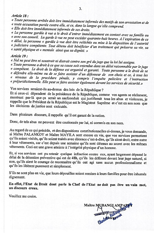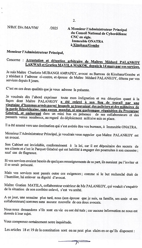 Médard Palankoy a été arrêté manu militari dans son cabinet d’avocat par les services du Conseil national de cyberdéfense le 14 mars. Alors qu’il s’est rendu pour se renseigner sur la situation de son confrère, Maître Gratien Mayila s’est vu, lui aussi, arrêter. Les familles de ces deux avocats s’inquiètent sur leur santé, et n’ont depuis, aucune nouvelle les concernant. «Nous nous demandons s’ils sont en vie ou ont été tués ; car aucune information ne nous est donnée à leur sujet», écrit son épouse, Me Charlotte Mubangi, à l’Administrateur principal du CNC. Voir le fac-similé ci-dessous.