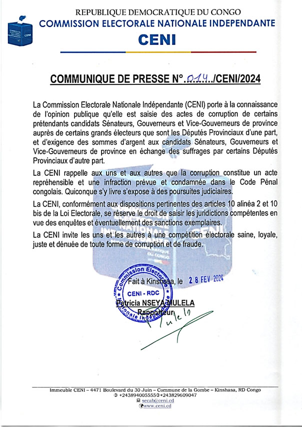 Bluff ou réalité, les mêmes tares décriées lors des scrutins combinés de 2019 reviennent. Dans un communiqué daté d’hier mercredi 28 février, parvenu à la Rédaction de Forum des As, le Rapporteur de la Commission électorale nationale indépendante (CENI), Patricia Nseya, alerte l’opinion des faits de corruption de la part des candidats gouverneurs, vice-gouverneurs et Sénateurs qui proposeraient de fortes sommes d’argent aux députés provinciaux pour les voter.