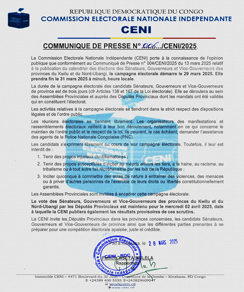 La Commission Électorale Nationale Indépendante (CENI) a dévoilé hier mercredi 26 mars, le calendrier électoral pour l'élection des sénateurs, gouverneurs et vice-gouverneurs des provinces du Kwilu et du Nord-Ubangi. Ce scrutin, crucial pour l'équilibre institutionnel de ces entités, se tiendra dans un cadre strictement réglementé afin de garantir un processus démocratique apaisé et transparent.