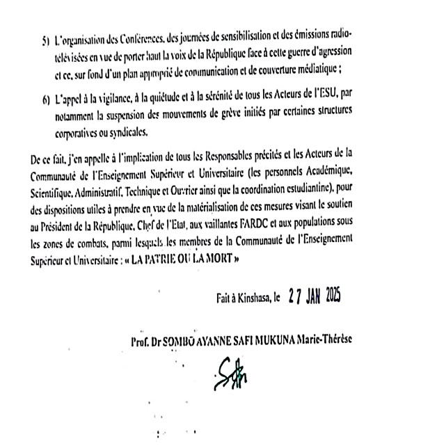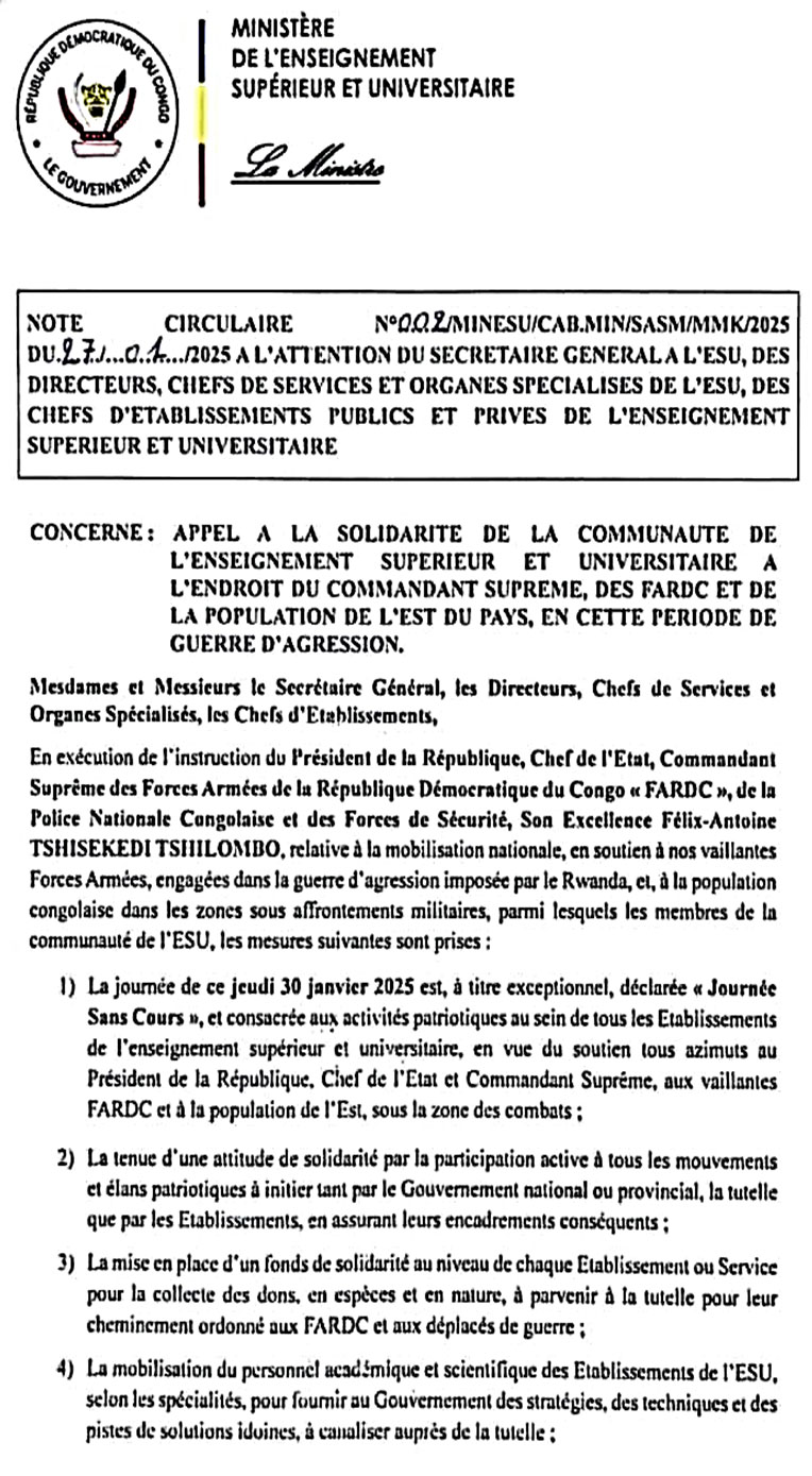 Dans une démarche patriotique majeure, la ministre de l’Enseignement supérieur et universitaire (ESU), Marie-Thérèse Sombo, a annoncé, dans une note circulaire publiée le lundi 27 janvier 2025, une initiative nationale en soutien aux Forces armées de la République démocratique du Congo (FARDC). Le jeudi 30 janvier a été officiellement décrété «journée sans cours», exclusivement dédiée à des activités patriotiques au sein des établissements d’enseignement supérieur et universitaire.