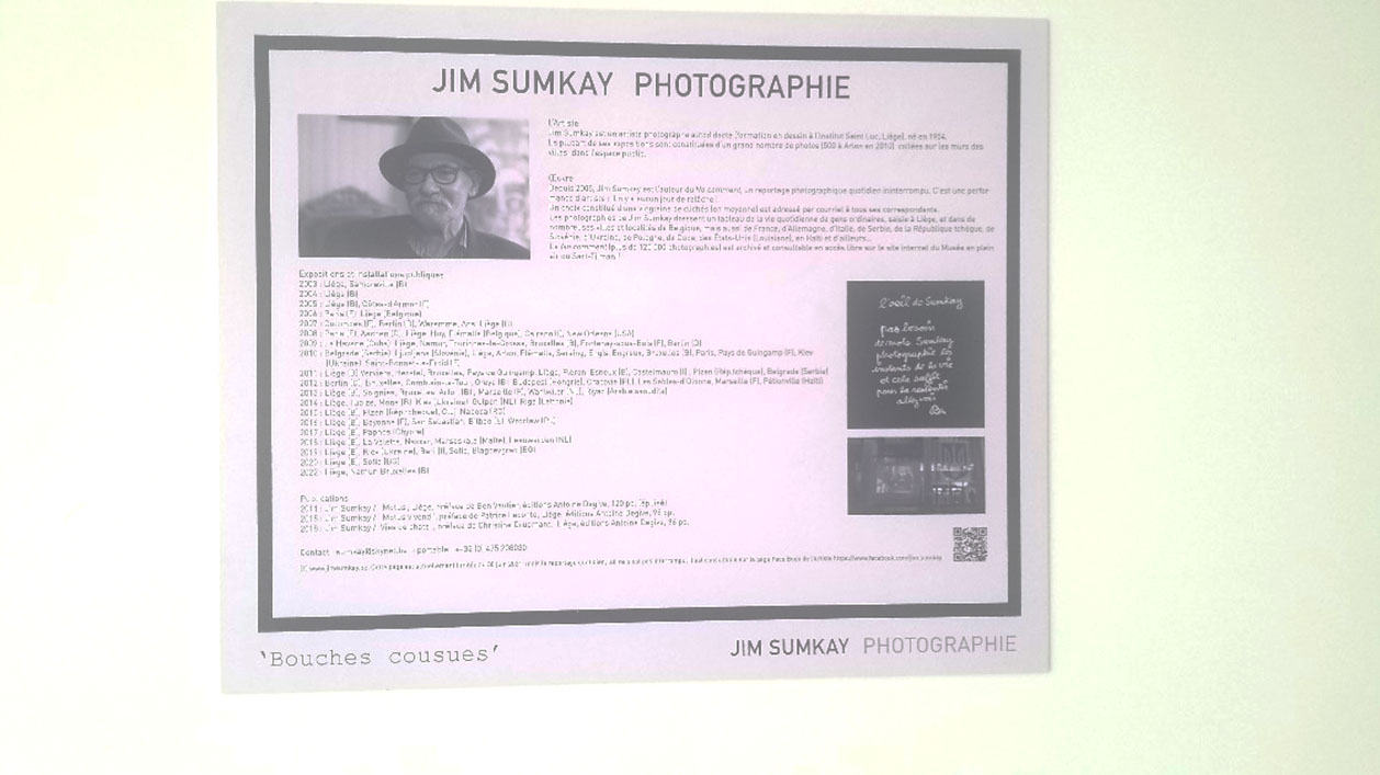 Né en 1954, Jim Sumkay a été formé en dessin à l’Institut Saint Luc de Liège (Belgique). La plupart de ses expositions sont constituées d’un grand nombre de photos collées sur les murs des villes, dans l’espace public. Depuis 2005, il est l’auteur de ‘‘No comment’’, un reportage photographique ininterrompu. Une performance d’artiste, d’autant qu’il n’y a aucun jour de relâche. Yves KALIKAT