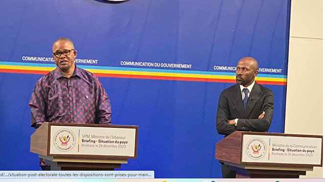 Le Gouvernement rassure de dispositions sécuritaires prises pour maintenir l’ordre public sur l’ensemble du pays durant la période post-électorale. L’Exécutif l’a fait savoir lors du briefing presse animé hier mardi 26 décembre par le ministre de l’Information et Médias, Patrick Muyaya, et le Vice-Premier ministre en charge de l’Intérieur, Peter Kazadi, sur la situation générale post-électorale dans le pays.