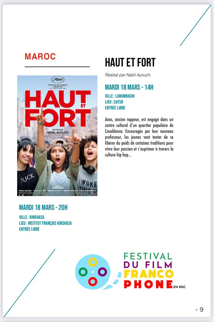 Dans le cadre du Festival du film francophone en RDC, le film "Haut et Fort", réalisé par Nabil Ayouch, sera projeté ce mardi 18 mars, concomitamment à Lubumbashi (14h, CATSR) et à Kinshasa (20h, Institut français de Kinshasa /IFK). L’entrée est libre pour les deux séances.