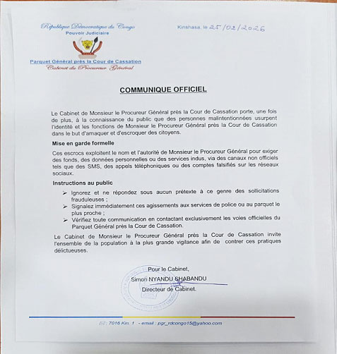 Le Procureur général près la Cour de cassation, Firmin Mvonde Mambu, met en garde des personnes malveillantes contre l'usurpation de son identité et les fonctions dans le but d'arnaquer des citoyens.