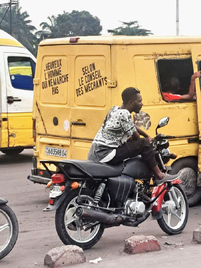 " Heureux l'homme qui ne marche pas selon le conseil des méchants. Qui ne s'arrête pas sur la voie des pécheurs. Et qui ne s'assied pas en compagnie des moqueurs ", lit-on dans Psaumes (Ps 1,1). Ce verset biblique a inspiré un propriétaire d'un bus à Kinshasa qui l'a gravé sur la coque arrière de son véhicule.