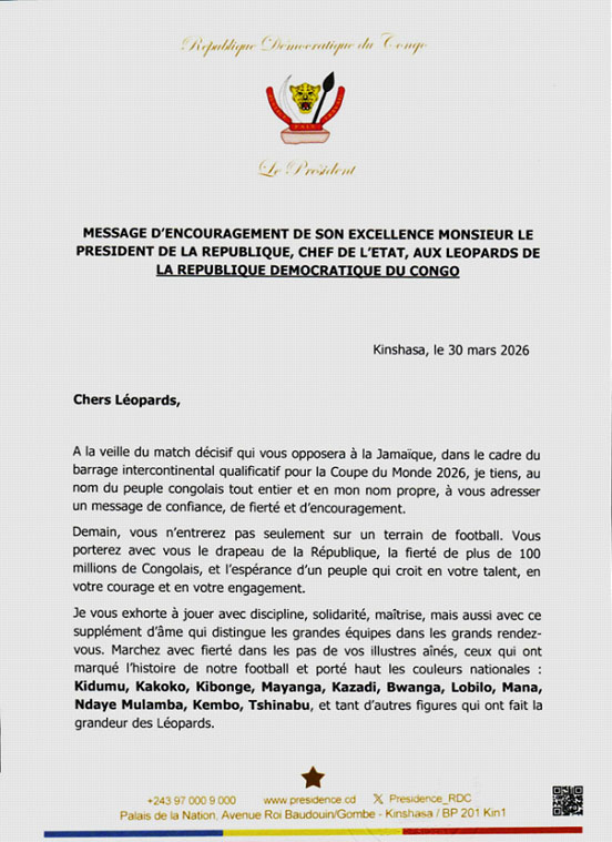 À la veille d'un rendez-vous décisif, le match de barrage intercontinental face à la Jamaïque pour une qualification au mondial 2026, lequel pourrait faire basculer toute une génération dans l'histoire, le président Félix Tshisekedi a adressé à la sélection nationale de football (Les Léopards) un message émouvant et mobilisateur hier mardi 30 mars.