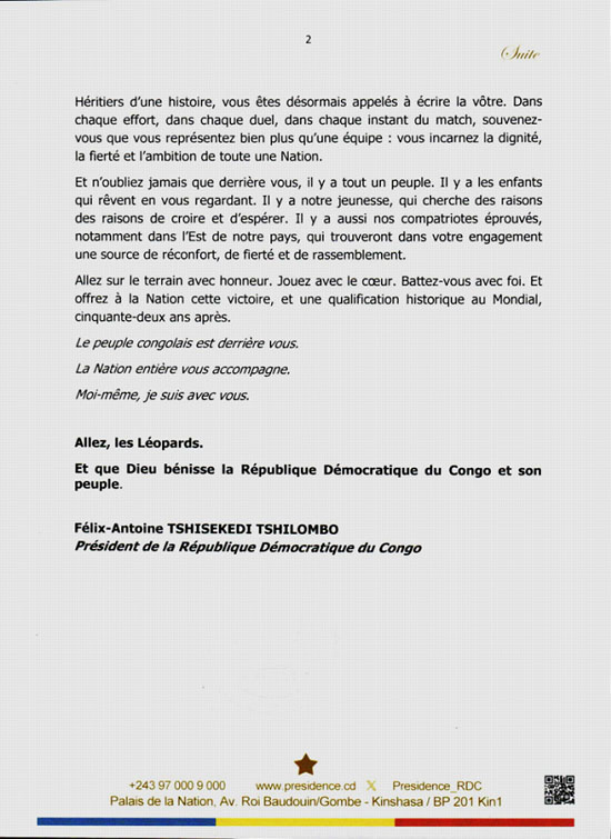 Convoquant avec gravité et fierté la mémoire des légendes qui ont forgé l'âme du football congolais, il en appelle à l'héritage, à la discipline et à ce supplément d'âme qui distingue les grandes nations dans les moments de vérité.