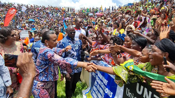 Sa descente hier au stade Joseph Kabila de Kalemie a été un franc succès. Attendue comme un but de championnat, Marie-Olive Lembe Kabila a drainé des milliers de femmes dans ce stade omnisports de 15.000 places, rempli comme un œuf. La mobilisation dans la capitale du Tanganyika était telle que l’évènement a quasiment volé la vedette à la cérémonie officielle du lancement des activités du mois de la femme, le mardi 8 mars à Mbandaka, commentent nombre d’observateurs.