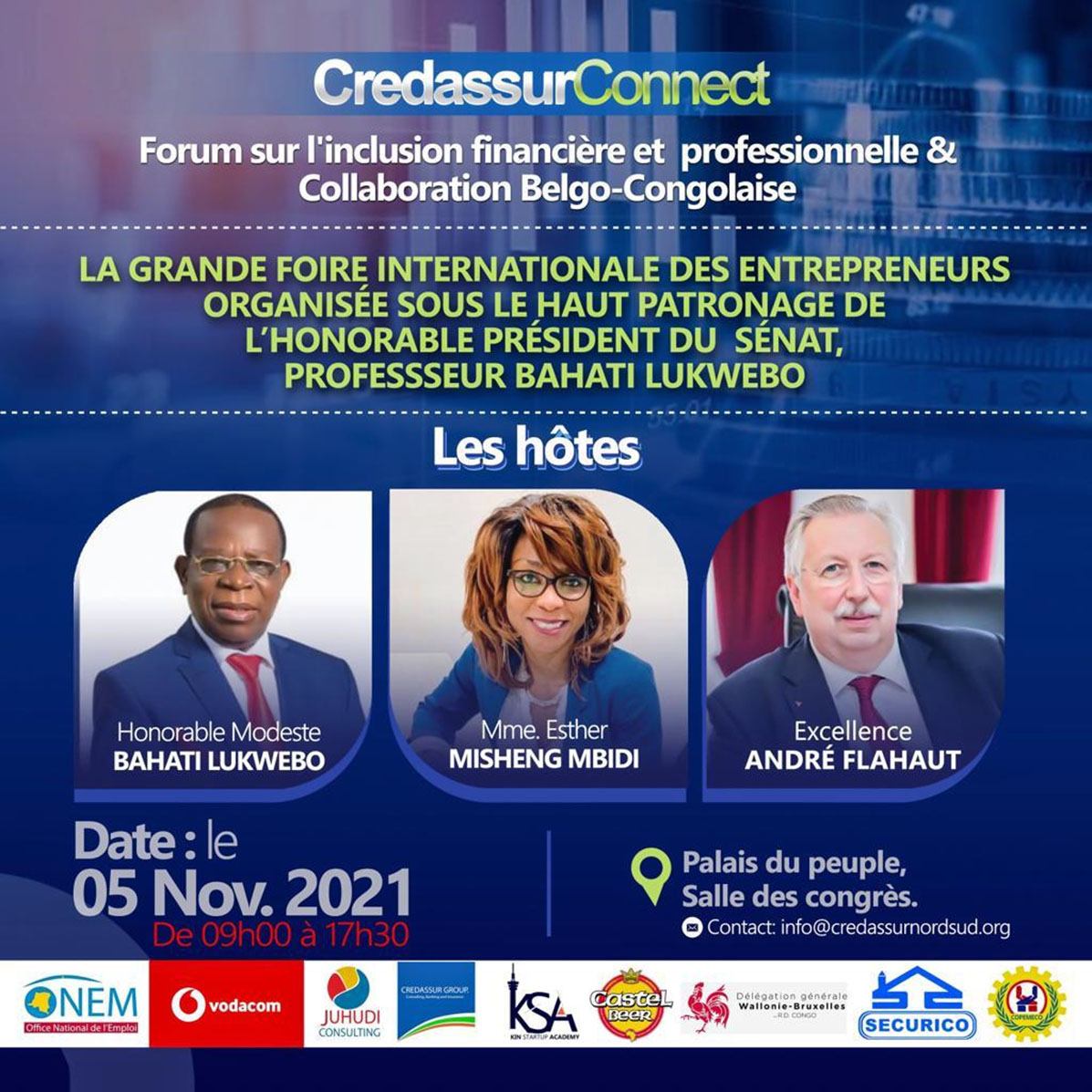 La ville province de Kinshasa va abriter, le 5 novembre prochain, la grande foire internationale des entrepreneurs. Ces assises seront organisées par l’Asbl CredassurNordSud, sous le haut patronage du président du Sénat, Modeste Bahati Lukwebo, et du ministre d’Etat belge André Flahaut.