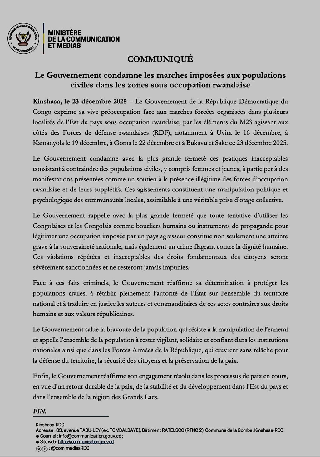 Le Gouvernement a vigoureusement condamné, hier mardi 23 décembre, les marches forcées imposées aux populations civiles dans plusieurs localités de l’Est du pays sous occupation rwandaise. Dans un communiqué officiel, Kinshasa dénonce des pratiques qualifiées d’inhumaines et de manipulatrices, imputées aux éléments du M23 agissant aux côtés des Forces de défense rwandaises, et y voit une grave atteinte à la souveraineté nationale, aux droits fondamentaux des citoyens et à la dignité humaine. Tout en réaffirmant sa détermination à protéger les civils et à poursuivre les auteurs de ces actes, le Gouvernement appelle à la vigilance collective et réitère son engagement en faveur d’un retour durable de la paix dans l’Est de la RDC et dans la région des Grands Lacs.