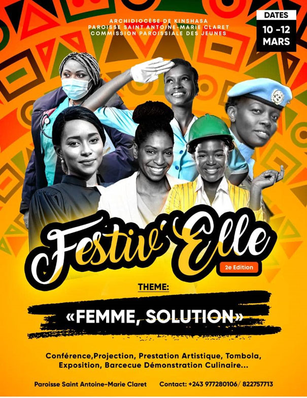La commission paroissiale des jeunes de Saint Antoine-Marie Claret, annonce la tenue de la 2ème édition du Festiv’elle du 10 au 12 mars à Kinshasa. Cette année l’événement portera sur le thème: « Femme, Solution » et présentera diverses activités notamment le master class, les ateliers, les activités culturelles.