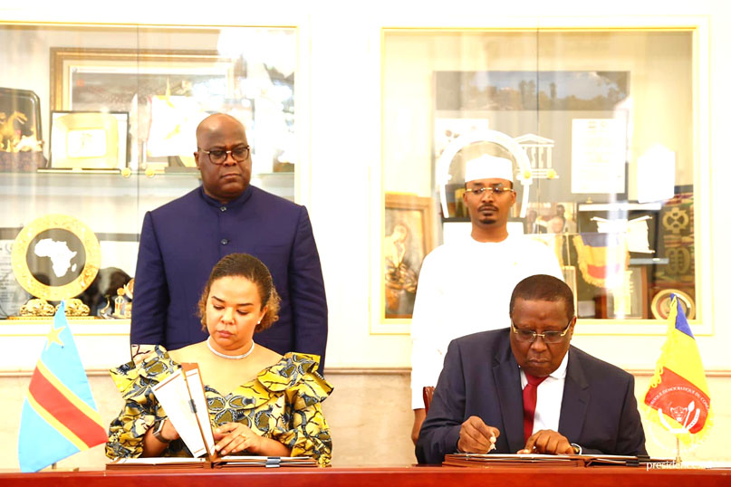 Les ministres sectoriels des deux pays, ont signé hier mardi 25 juin, en présence des deux Chefs d’État Félix Tshisekedi et Mahamat Idris Deby Itno, trois accords, à savoir : l’accord-cadre de coopération globale, l’accord d’exemption de visa réciproque pour les citoyens de chaque pays et l’accord pour des consultations diplomatiques régulières.