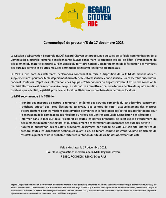La Mission d’Observation Electorale (MOE) Regard Citoyen est préoccupée au sujet de la faible communication de la Commission Electorale Nationale Indépendante (CENI) concernant la situation exacte de l’état d’avancement du déploiement du matériel électoral sur l’ensemble du territoire national, du déroulement de la formation des membres des bureaux de vote et d’autres mesures permettant de garantir l’intégrité du processus.