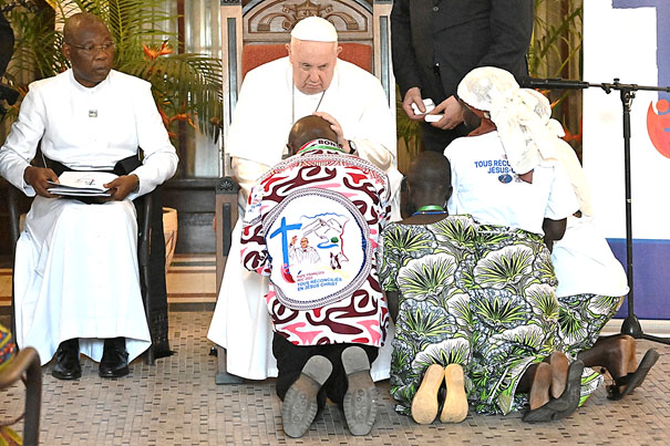 Frères et sœurs, fils et filles de l’Ituri, du Nord et du Sud Kivu, je suis proche de vous, je vous étreins et je vous bénis tous. Je bénis chaque enfant, adulte, personne âgée, chaque personne blessée par la violence en République Démocratique du Congo, en particulier chaque femme et chaque mère. Et je prie pour que la femme, toute femme, soit respectée, protégée et valorisée : commettre une violence sur une femme et sur une mère, c’est la faire à Dieu lui-même, qui, d’une femme, d’une mère, a pris la condition humaine. Que Jésus, notre frère, Dieu de la réconciliation qui a planté l’arbre de vie de la croix au cœur des ténèbres du péché et de la souffrance, Dieu de l’espérance qui croit en vous, en votre pays et en votre avenir, qu’il vous bénisse et vous console. Qu’il répande sa paix dans vos cœurs, dans vos familles et dans toute la République Démocratique du Congo.