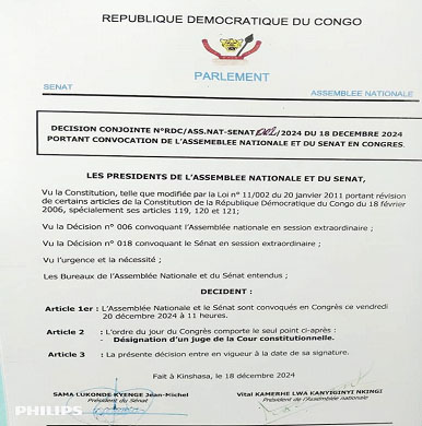 L''Assemblée nationale et le Sénat se réunissent ce vendredi 20 décembre en congrès pour procéder à la désignation d'un juge à la Cour constitutionnelle. Cette réunion, annoncée par les présidents des deux chambres, Vital Kamerhe et Jean-Michel Sama Lukonde Kyenge, s'inscrit dans le cadre de renouvellement institutionnel prévu par la Constitution.