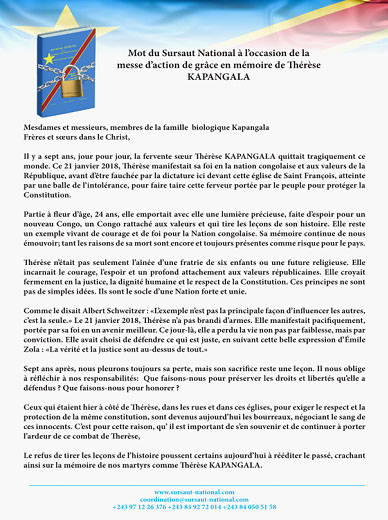 "Pour nous, au Sursaut National, le meilleur hommage que nous pouvons rendre à la sœur Thérèse et aux autres, c'est avant tout de nous engager, de nous rassembler et de poursuivre avec fermeté le combat contre le changement de la Constitution. Kapangala, Rossy Mukendi, Hussein Ngandu, Nkulula et tant d'autres ne sont pas morts pour rien?"