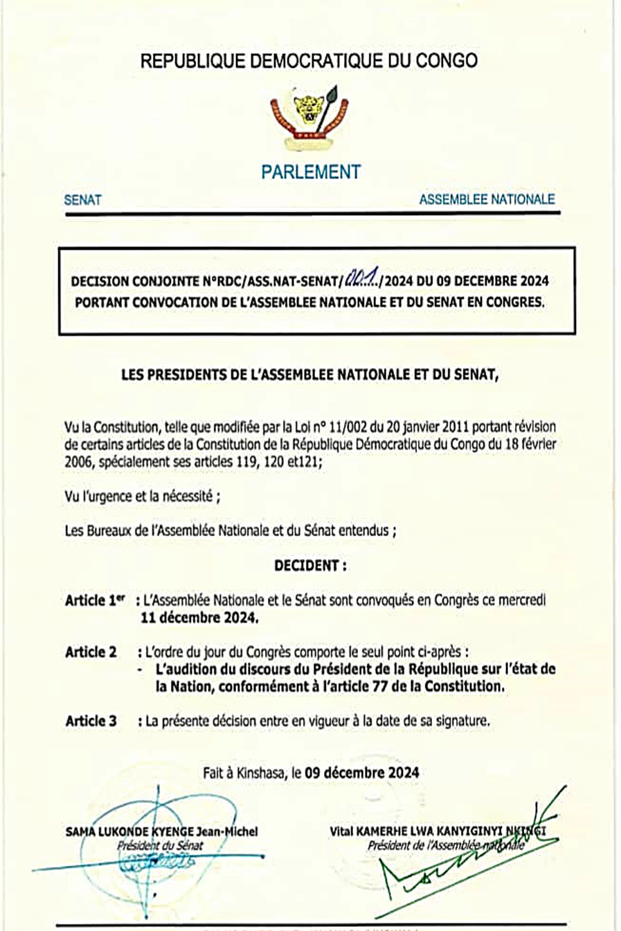 Le Président de la République, Félix Tshisekedi, sera ce mercredi 11 décembre, devant le Parlement réuni en Congrès pour prononcer le traditionnel discours sur l’état de la nation. L’acte de convocation de ce Congrès a conjointement été signé lundi par Sama Lukonde et Vital Kamerhe, respectivement présidents du Sénat et de l’Assemblée nationale.