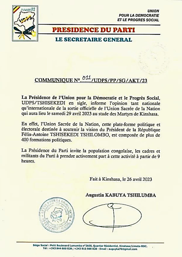L’UDPS invite les combattants à aller en nombre au stade des Martyrs
