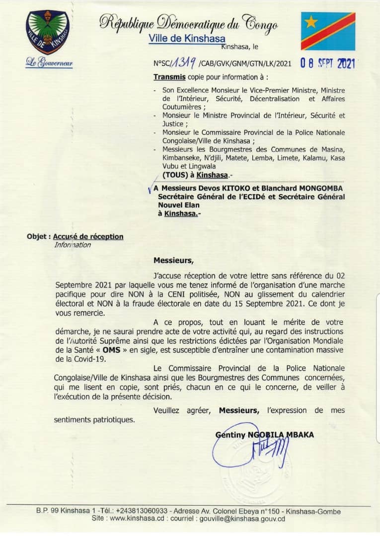 Prévue ce mercredi 15 septembre, la marche de la coalition Lamuka pour dire « Non à la Ceni politisée, non au glissement du calendrier électoral et non à la fraude électorale » n’aura probablement pas lieu, à moins d’un forcing de cette plate-forme de l’opposition. Et pour cause, le gouverneur de la ville de Kinshasa, Gentiny Ngobila n’a pas pris acte de cette activité.