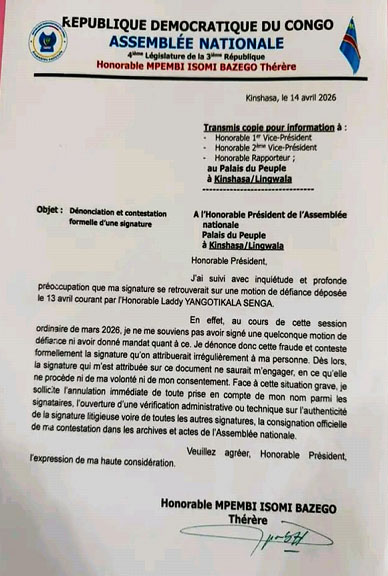 À Kinshasa, un document émanant de l'Assemblée nationale suscite depuis quelques heures de nombreuses réactions au sein de l'opinion publique. En cause : la contestation formelle d'une signature attribuée à l'Honorable Mpembi Isomi Bazego Thérère dans le cadre d'une motion de défiance contre le VPM de l'intérieur Jacquemain Shabani.