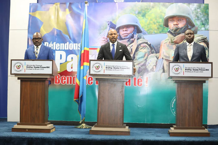 Le Ministre des Finances, Nicolas Kazadi, le Directeur de cabinet adjoint du Président de la République chargé des questions économiques et financières, André Wameso et le ministre de la Communication et Médias, Porte-parole du Gouvernement, Patrick Muyaya, ont animé conjointement hier lundi 28 août, un briefing presse consacré au dossier Primera RDC : enjeux, retombées et perspectives du partenariat stratégique émirati-congolais dans le secteur de l’or artisanal et des 3T.