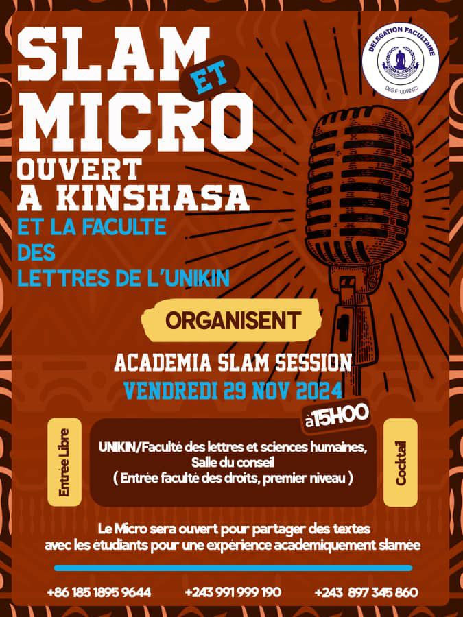 La Faculté des Lettres et Sciences humaines de l’Université de Kinshasa (Unikin), accueillera ce vendredi 29 novembre la toute première édition de l’Académia Slam Session. Cet événement, organisé par Slam & Micro ouvert à Kinshasa (S.M.O.K), se veut une plateforme d’expression artistique au cœur de l’univers académique.