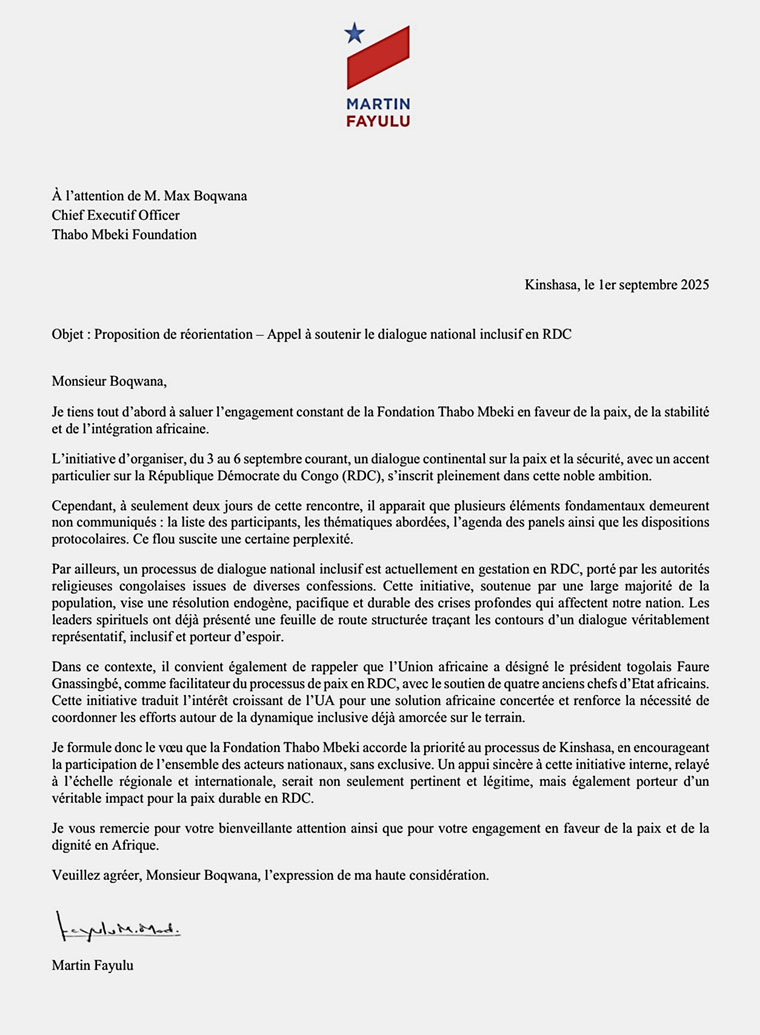 Dans une correspondance adressée au directeur exécutif de la Fondation Thabo Mbeki, M. Max Boqwana, l'opposant congolais Martin Fayulu salue l'engagement de cette organisation pour la paix et l'intégration africaine, tout en l'invitant à soutenir prioritairement le processus de dialogue inclusif actuellement en cours en République démocratique du Congo.
