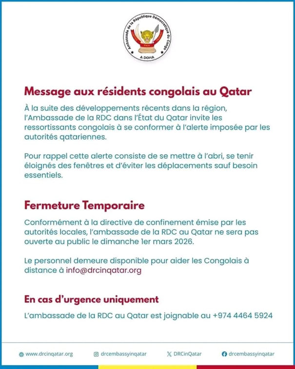 Conformément à la directive de confinement émise par les autorités locales, l’ambassade de la RDC au Qatar n’était pas ouverte au public le dimanche 1er mars 2026. Cette décision s’inscrit dans le respect des mesures de sécurité en vigueur dans le pays hôte.