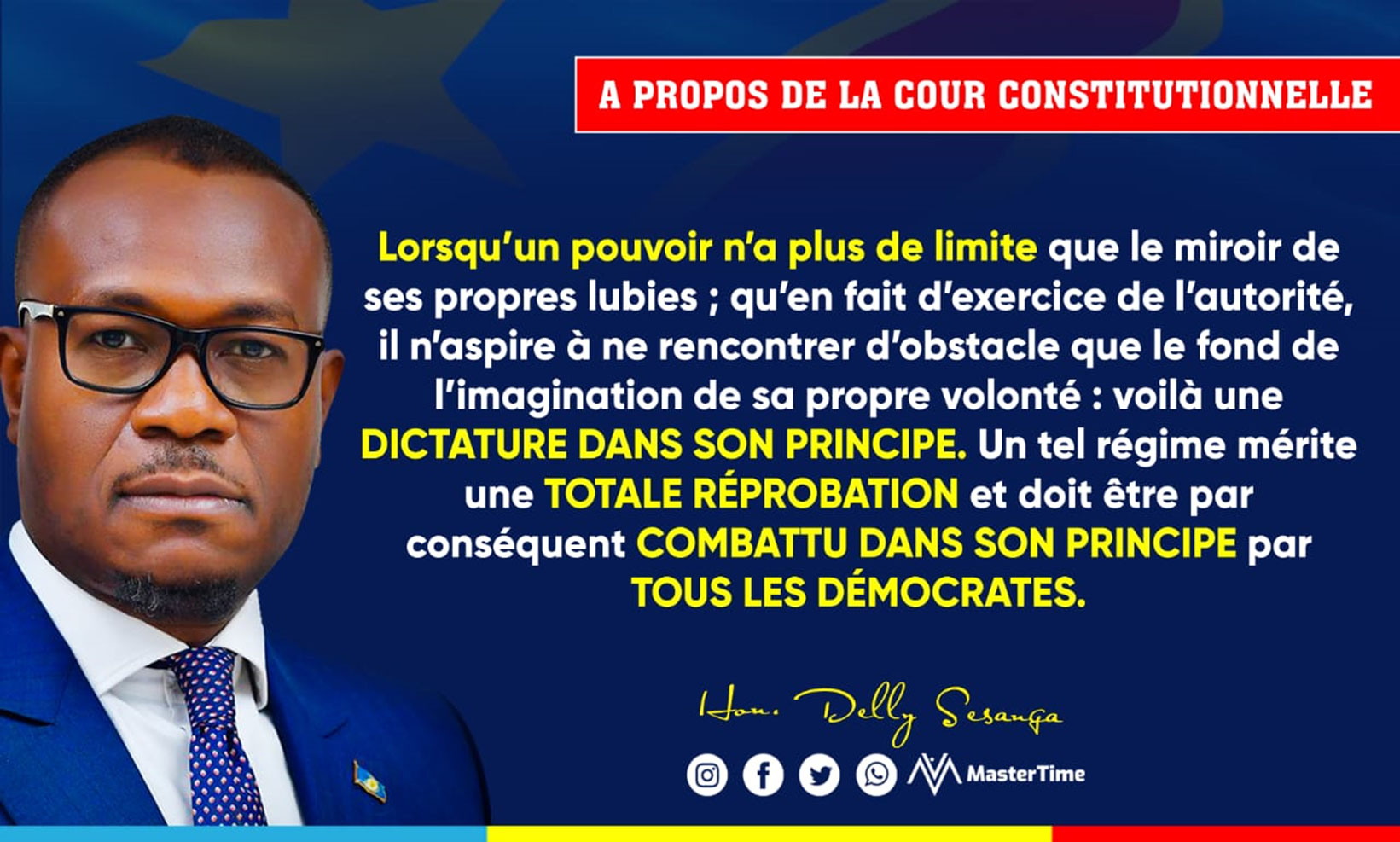 « Lorsqu’un pouvoir n’a plus de limite que le miroir de ses propres lubies ; qu’en fait d’exercice de l’autorité, il n’aspire à ne rencontrer d’obstacle que le fond de l’imagination de sa propre volonté : voilà une dictature dans son principe. Un tel régime mérite une totale réprobation et doit être, par conséquent, combattu dans son principe par toutes les démocrates », lâche-t-il. GK & YKM