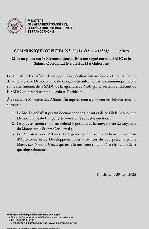 Réagissant à un communiqué publié sur le site de la SADC, la République démocratique du Congo, à travers son ministère des Affaires étrangères, a éclairé l'opinion sur le mémorandum d'entente signé entre la Communauté de développement d'Afrique australe (SADC) et la prétendue "république Sahraouie" le 2 avril 2025 à Gaborone, capitale du Botswana.