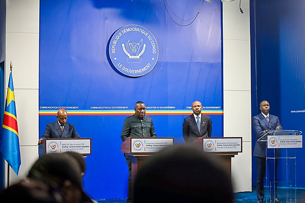 Le Directeur de Cabinet Adjoint du Président de la République chargé des questions Économiques et Financières, André Wameso, l’Inspecteur Général, Chef de Service de l’Inspection Générale des Finances, Jules Alingete Key, le Ministre d’Etat, Ministre des Infrastructures, Travaux Publics et Reconstruction, Alexis Gisaro Muvunyi et le ministre de la Communication et Médias, Porte-parole du Gouvernement, Patrick Muyaya, ont co-animé hier lundi 29 janvier, un briefing presse autour du «Rééquilibrage du contrat chinois : chiffres clés, autres avantages obtenus par la RDC et désenclavement».