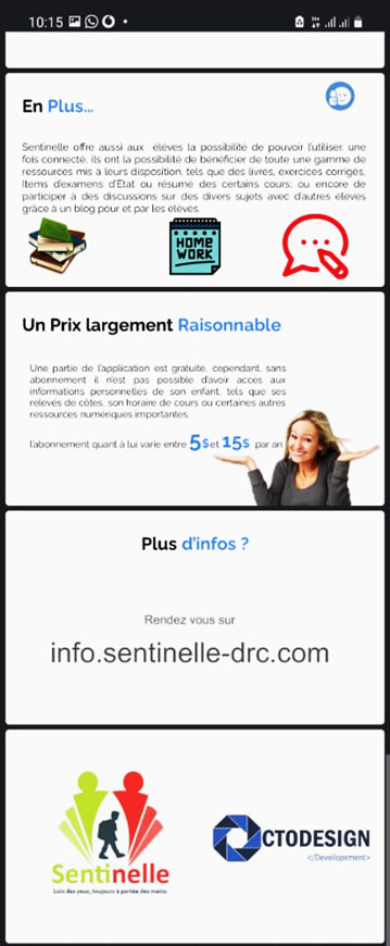 A l’en croire, « Sentinelle DRC » offre aussi aux élèves la possibilité de pouvoir l’utiliser une fois connecté. Ils ont ainsi la possibilité de bénéficier de toute une gamme de ressources à leurs dispositions notamment les livres, les revues des exercices corrigés, les items d’examens d’État, le résumé des certains cours. Ils peuvent aussi participer à des discussions sur divers sujets avec d’autres élèves grâce à un blog pour et par les élèves.