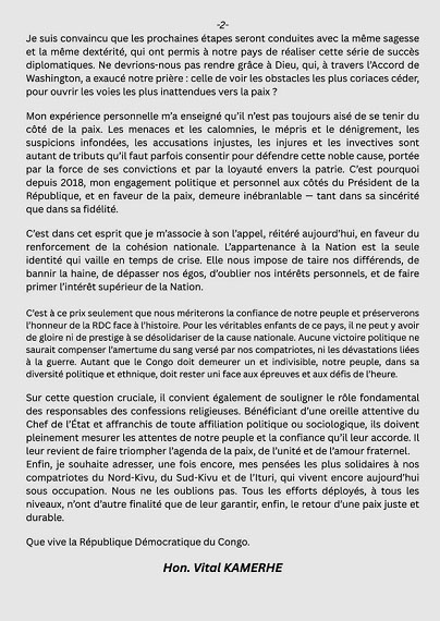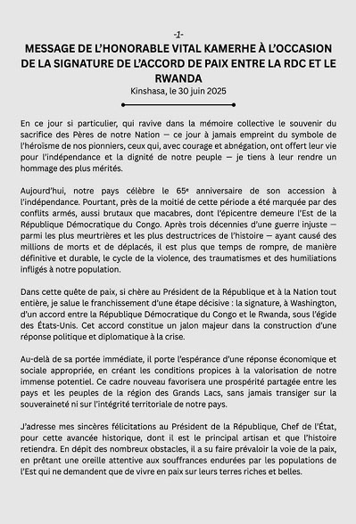 En ce 30 juin, les mots de Vital Kamerhe résonnent comme un appel au sursaut national, à la réconciliation et à la construction collective d'un Congo enfin réconcilié avec lui-même.