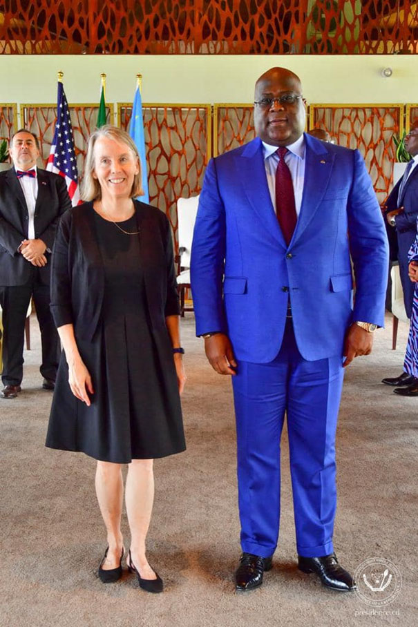Ambassadeur Lucy Tamlyn a présenté ses lettres de créance à S.E. Président Félix Tshisekedi le 6 février 2023 à Kinshasa. Diplomate de carrière avec grade de ministre conseiller, L’ambassadeur Tamlyn a rejoint le service diplomatique en 1982. Avant d’arriver à Kinshasa, elle a été chargée d’affaires à l’ambassade des États-Unis à Khartoum. Ambassadeur Tamlyn a précédemment été ambassadeur des États-Unis en République Centrafricaine 2019-2022 et ambassadeur des États-Unis en République du Bénin 2015-2018.